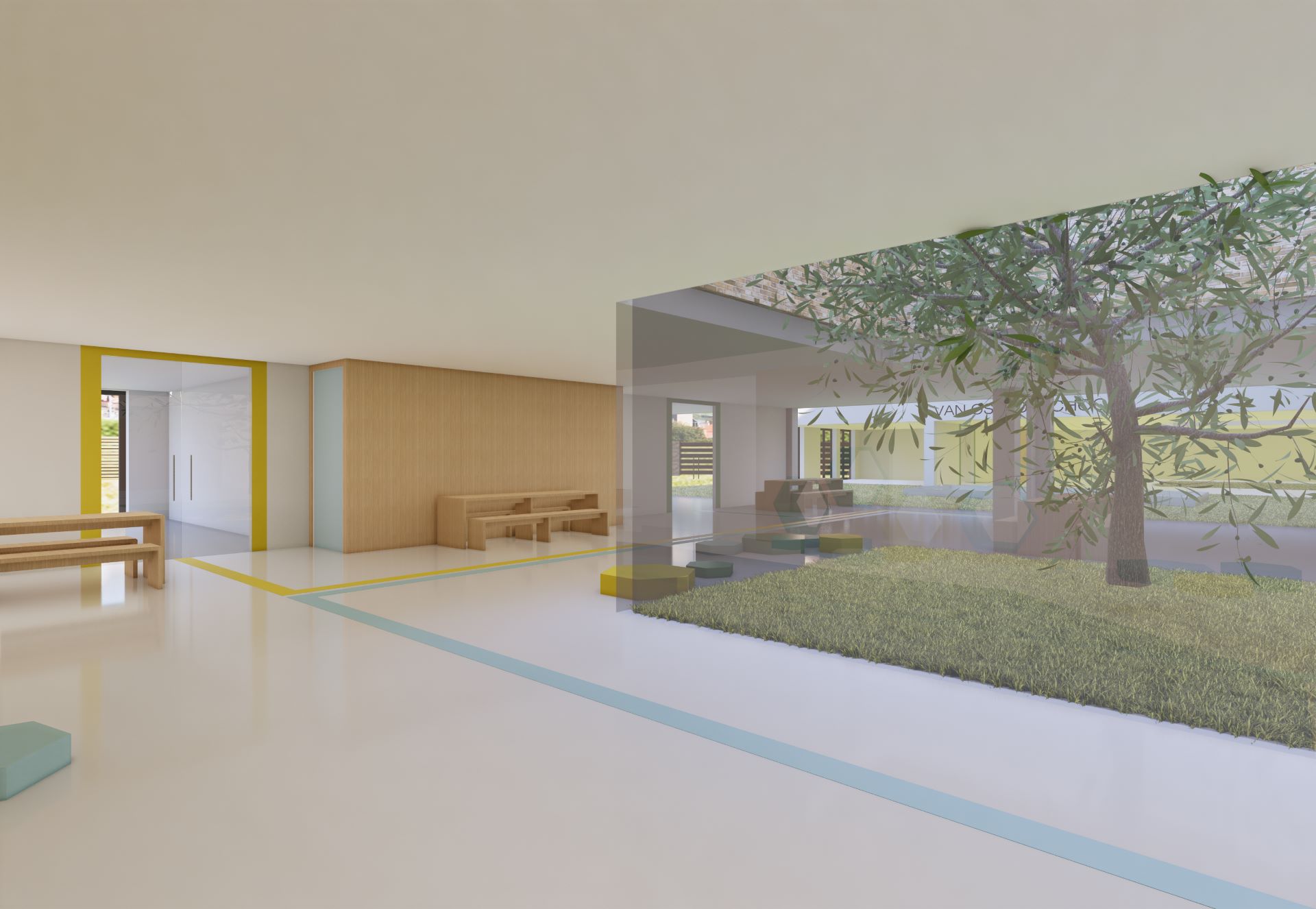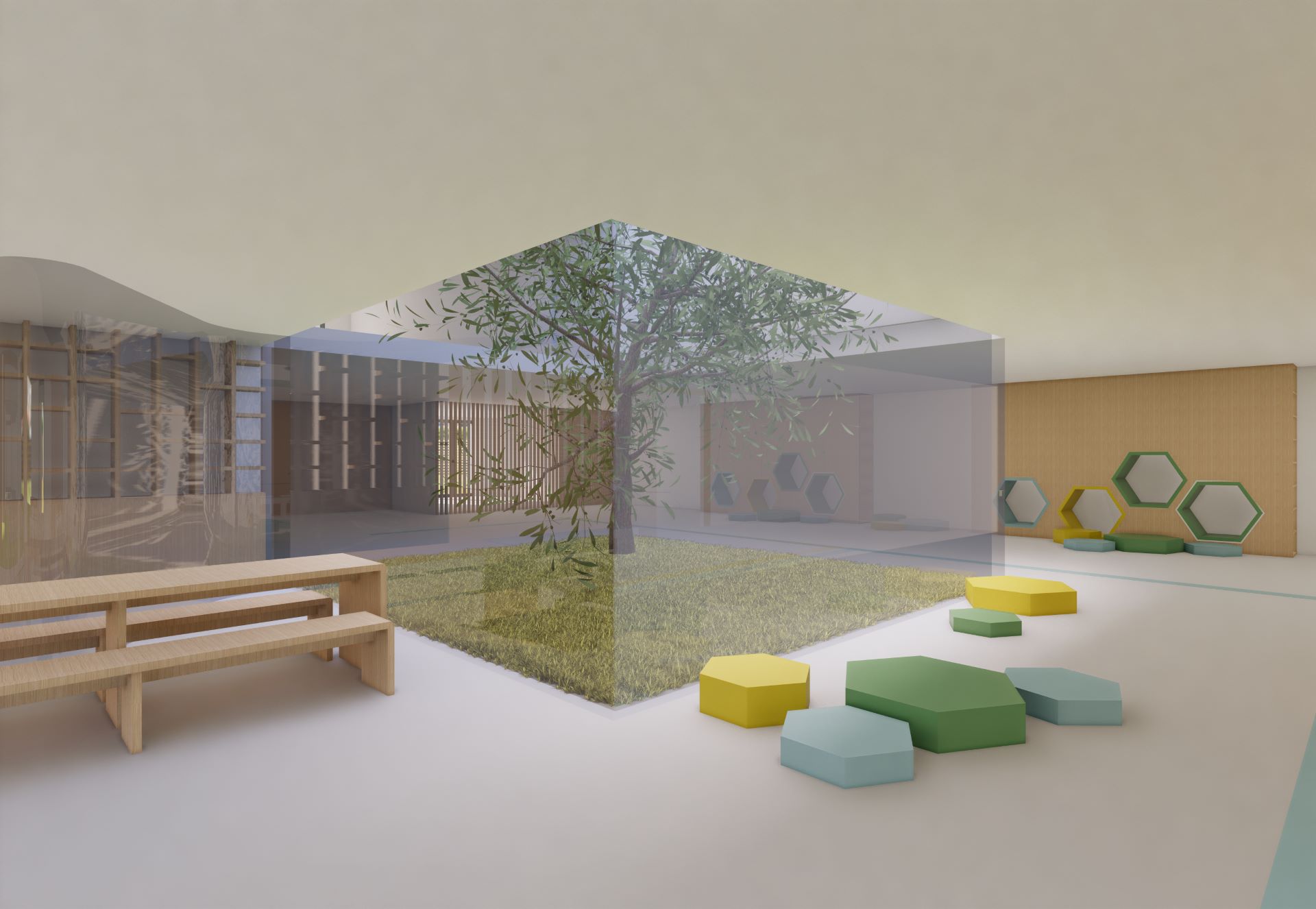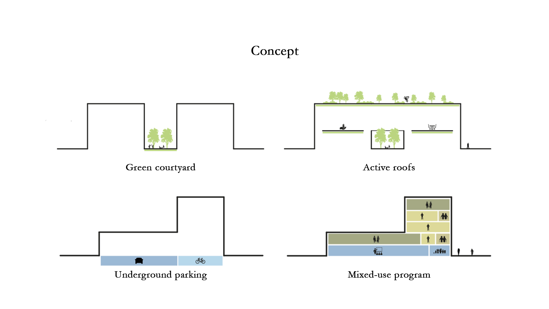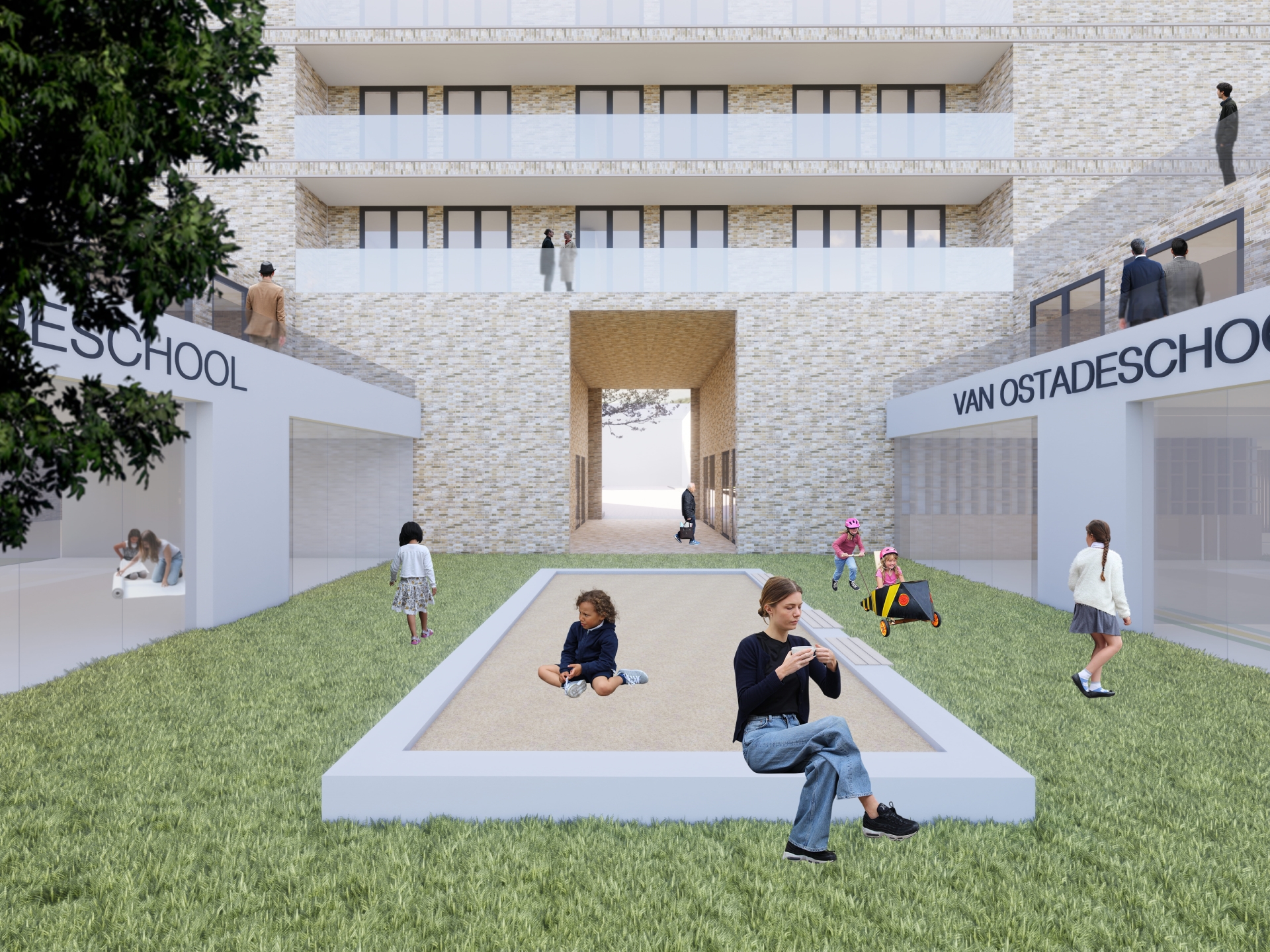 The first impression you perceive of a building is determined by its architectural appearance. It is the recognizable elements, such as the rhythm, use of materials and recognizability of the functions it accommodates. The design of Ostadeblok adopted these principles. From which the mixed-use program and rhythm of the façade with its horizontal and vertical interplay of lines in relation to its context have emerged. This rhythm is formed by the façade openings, combined with masonry piers and a horizontal articulation of concrete slabs with a soldier course brickwork in between. In addition to its appearance, the happiness of its users and residents are not just determined by a good design for their specific spaces, but also by contact with each other. That is why the social cohesion within the building is cultivated according to the concept of ‘groeten en ontmoeten’ (greeting and meeting). The stairwells and corridors are designed to encourage social interactions. And the courtyard and roofs of the elementary school and apartments are designed as communal spaces so that users and residents can come together or recreate.
